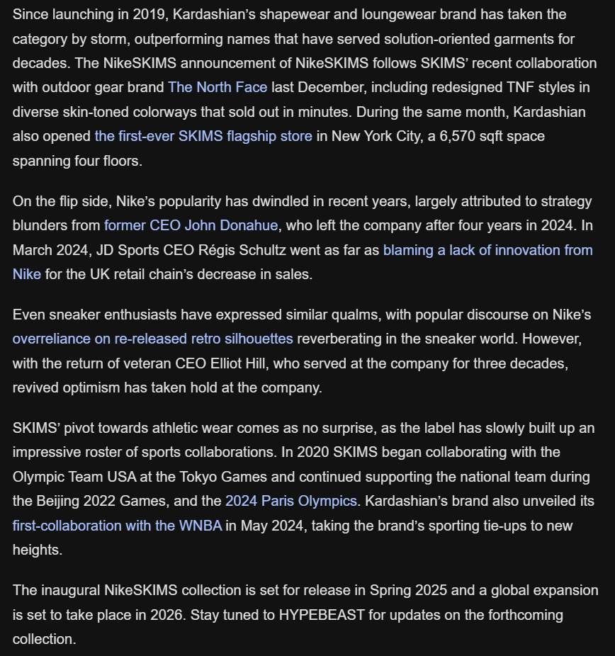 - Laura Islas, "Nike and Kim Kardashian team up to launch NikeSKIMS brand", 2025.02.18