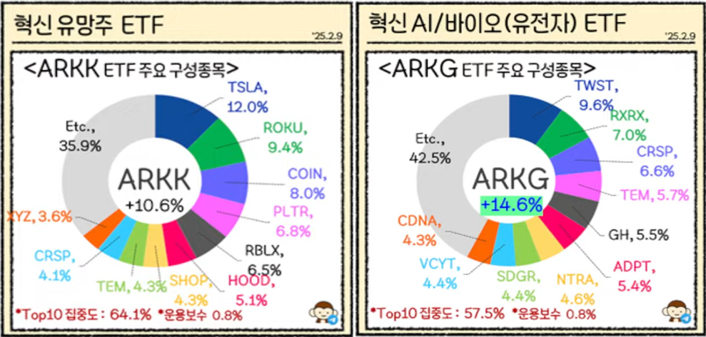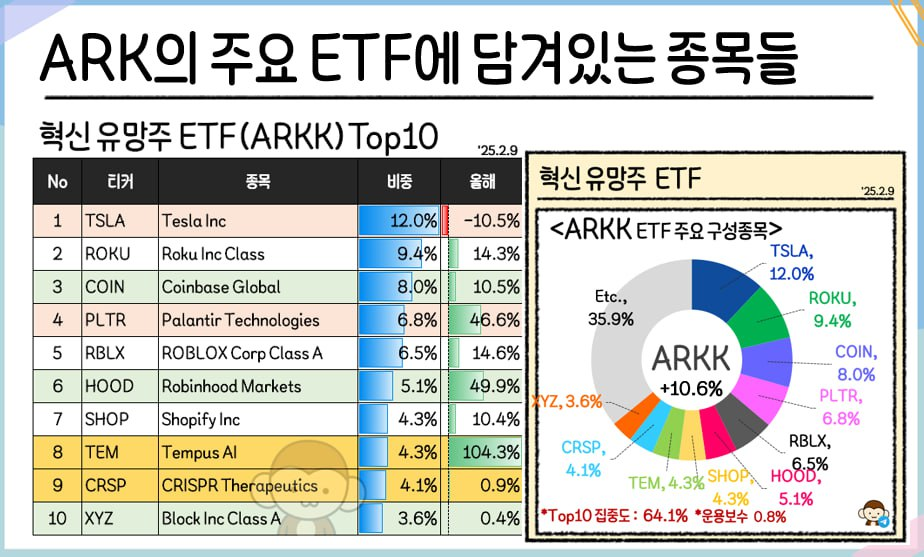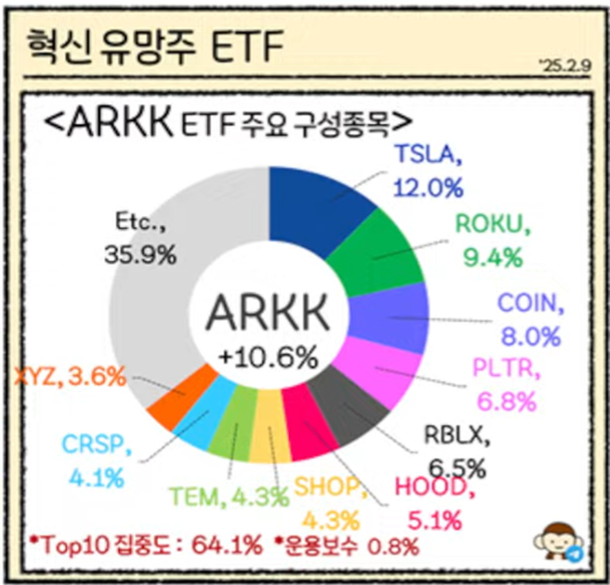 ARK Invest는 혁신적인 기술과 성장 가능성이 높은 산업에 집중 투자하는 전략을 가지고 있어요. 특히 인공지능, 로보틱스, 블록체인, 전기차, 유전자 기술 등 파괴적 혁신(Disruptive Innovation)을 중심으로 포트폴리오를 구성합니다.