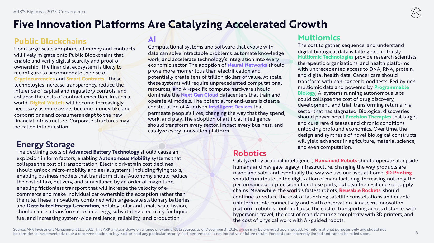 ARK Invest는 **AI, 로보틱스, 에너지 저장, 공공 블록체인, 다중 오믹스(Multiomics)** 이 5가지 기술이 산업과 경제를 혁신할 것이라고 전망하고 있어요.